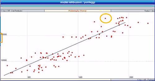Valutazioni Punteggi/RetribuzioniIl Grafico mette in relazione la retribuzione individuale con il punteggio attribuito a ciascuna risorsa in relazione a specifici parametri di valutazione abilità/ competenze studiati e applicati nel settore bancario.L’analisi dei risultati ottenuti permette di confrontare tra loro i vari casi aziendali, individuando potenziali anomalie e correlazioni atipiche in relazione al trend di settore.Caratteristico, ad esempio, è il caso evidenziato in figura: pur registrando un punteggio pari a 1600 circa - inferiore rispetto ad una significativa parte di popolazione aziendale - il soggetto in questione si colloca nella fascia retributiva più alta. Detta situazione si pone quindi in contrasto con la media dei risultati della realtà del settore.