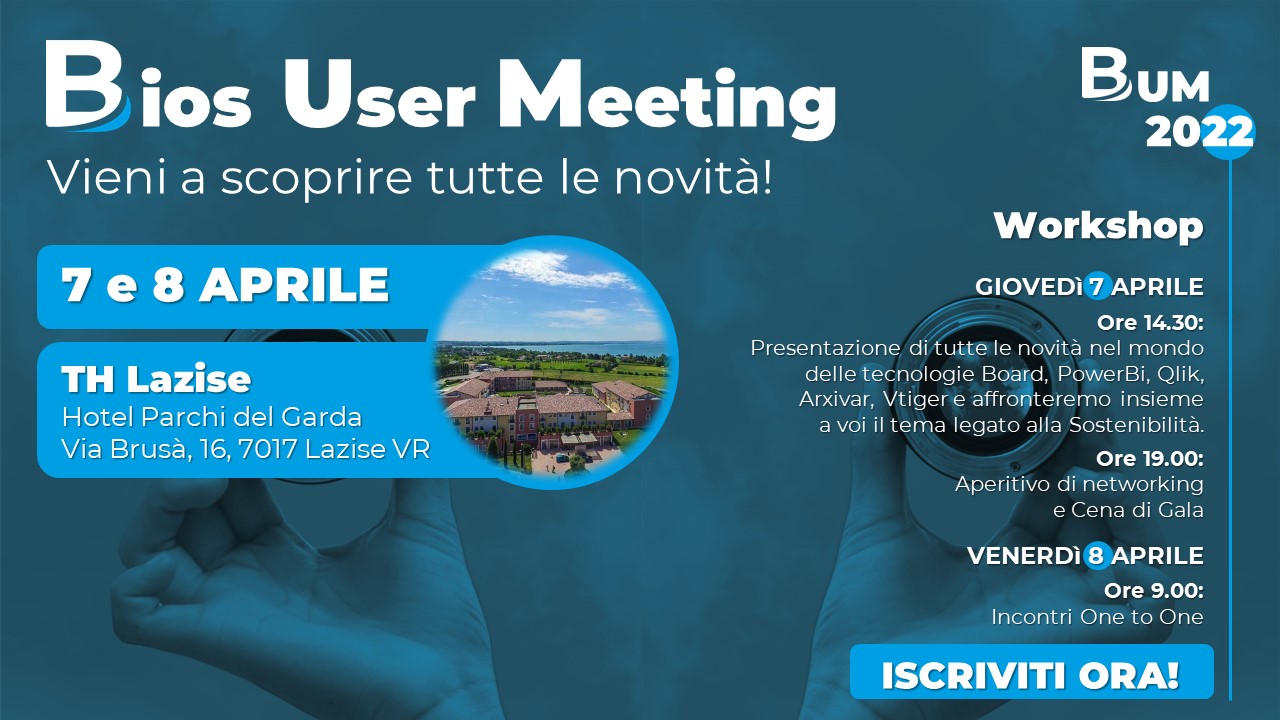 Con grande piacere comunichiamo la location e le date del prossimo Bios User Meeting 2022, workshop gratuito in cui presenteremo tutte le novità nel mondo delle tecnologie Board, PowerBi, Qlik, Arxivar, Vtiger e non solo, affronteremo insieme a voi anche la tematica legata alla Sostenibilità.