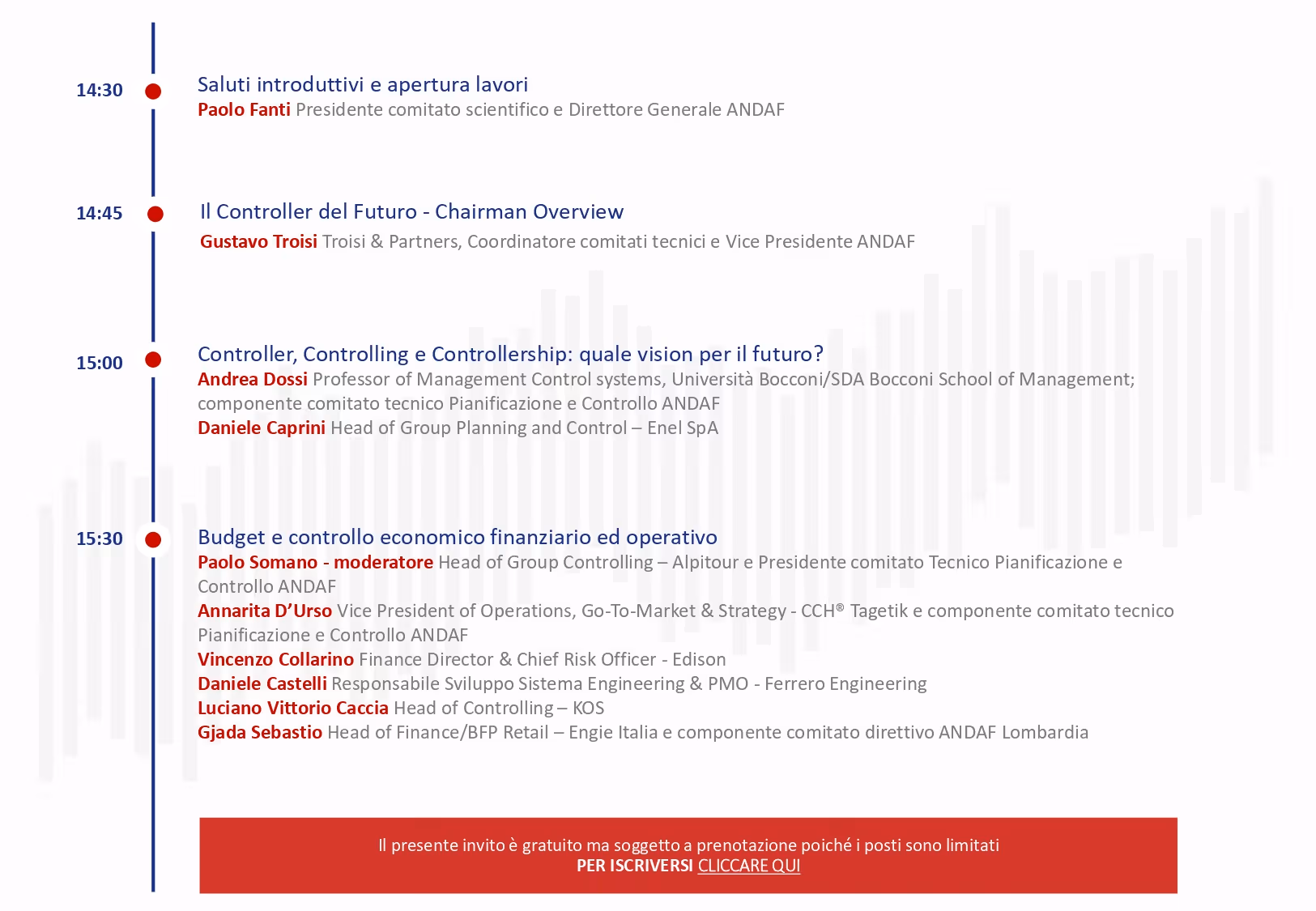 Un pomeriggio di confronto e approfondimento sulle nuove competenze richieste ai professionisti del controllo, sull’evoluzione dei modelli di pianificazione e sulle tecnologie che stanno ridefinendo il ruolo del controller all’interno delle organizzazioni.