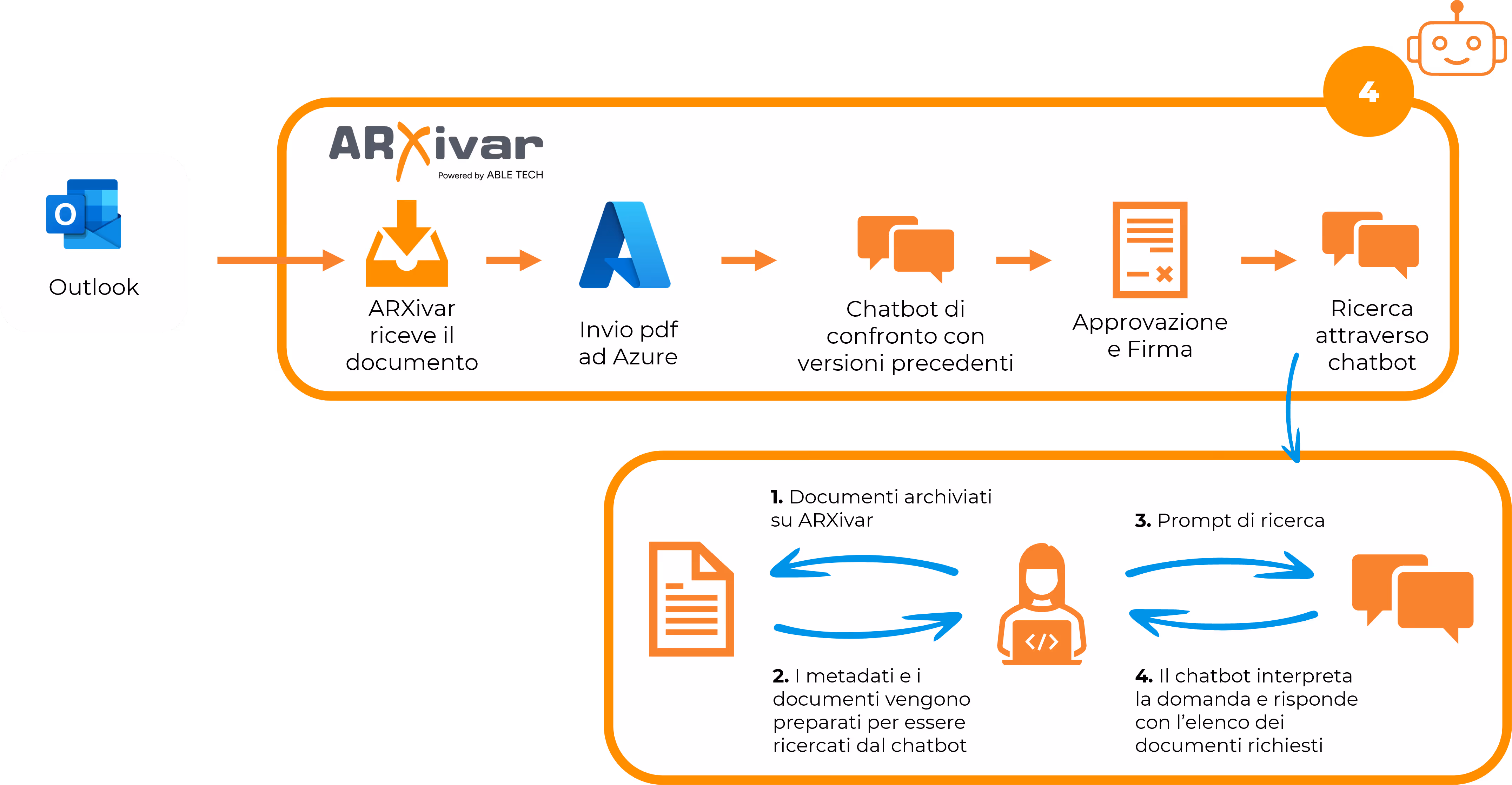 All’utente basterà avviare una semplice conversazione con il Chatbot per accedere ai dati più rilevanti e interagire con i contenuti archiviati in ARXivar in modo avanzato. Inoltre, è possibile configurare comandi personalizzati, progettati per automatizzare attività specifiche nel pieno rispetto delle regole di sicurezza e riservatezza del sistema.