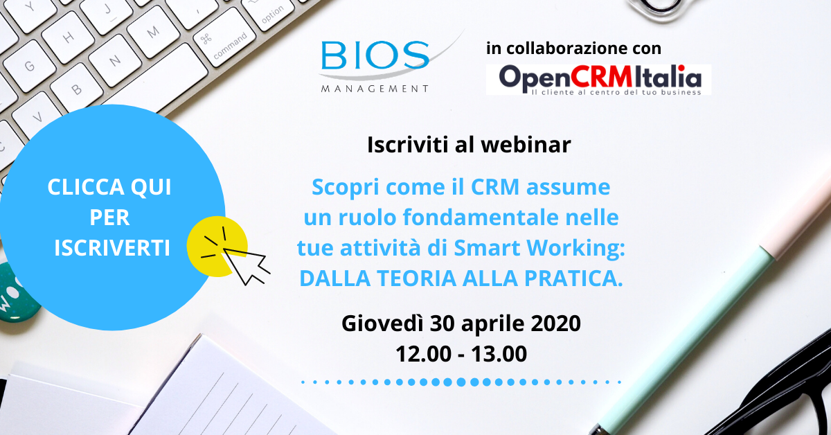 ISCRIVITI AL NOSTRO WEBINAR DI GIOVEDì 30 APRILE, DALLE ORE 12.00 ALLE ORE 13.00: Scopri come il CRM assume un ruolo fondamentale nelle tue attività di Smart Working: DALLA TEORIA ALLA PRATICA.