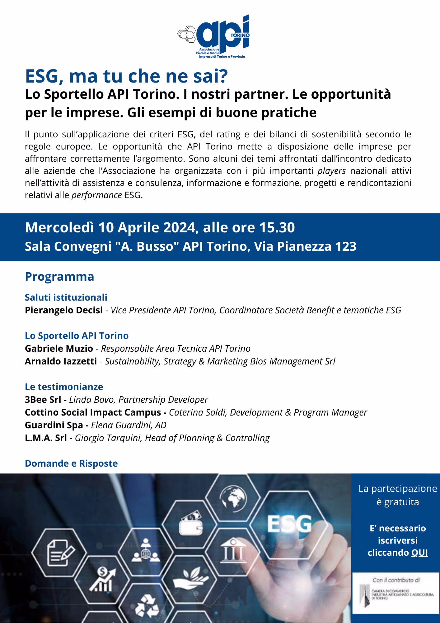 Ti aspettiamo mercoledì 10 aprile a Torino per l'evento ESG promosso da API Torino